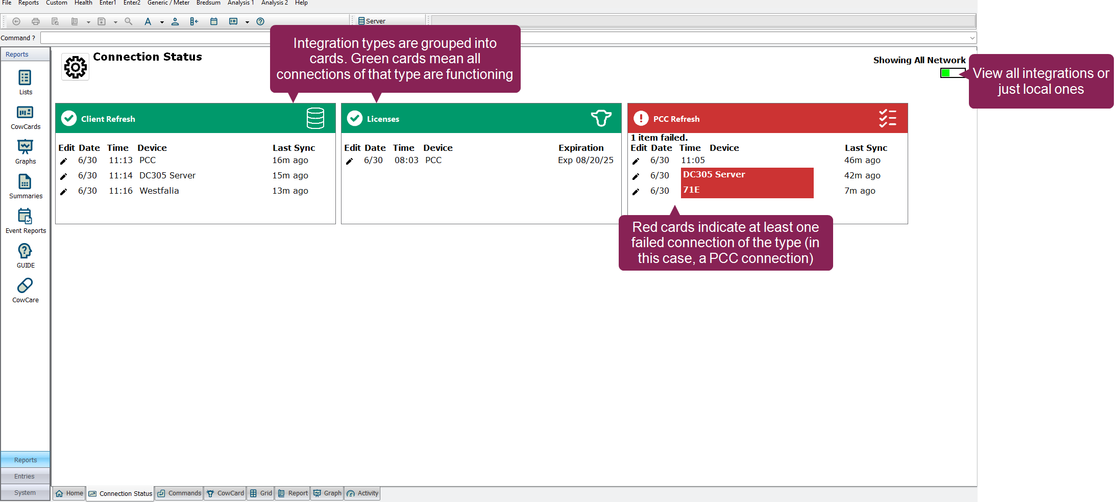 Showing All Network: Displays the status of all connections across the entire DairyComp network, including connections on other clients and servers. This provides a comprehensive, system-wide view.